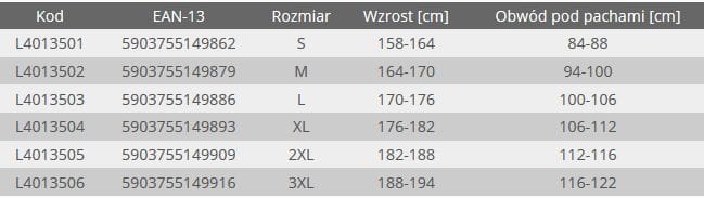 Poniżej tabela z rozmiarami dla lepszego doboru odzieży