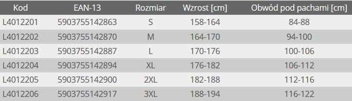 Poniżej tabela z rozmiarami dla lepszego doboru odzieży