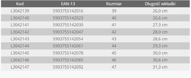Poniżej tabela z długościami wkładek dla lepszego doboru obuwia.