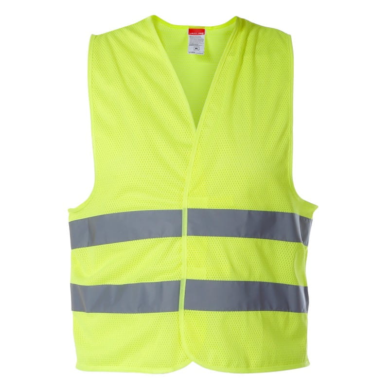 Kamizelka siatkowa w kolorze żółtym z pasami odblaskowymi wykonana ze 100% poliestru. Gramatura materiału 120g/m2. Siatkowa struktura materiału zapewnia wysoką przepuszczalność powietrza. Dwa odblaskowe pasy poprawiające widoczność. Kamizelka zapinana na rzepy.