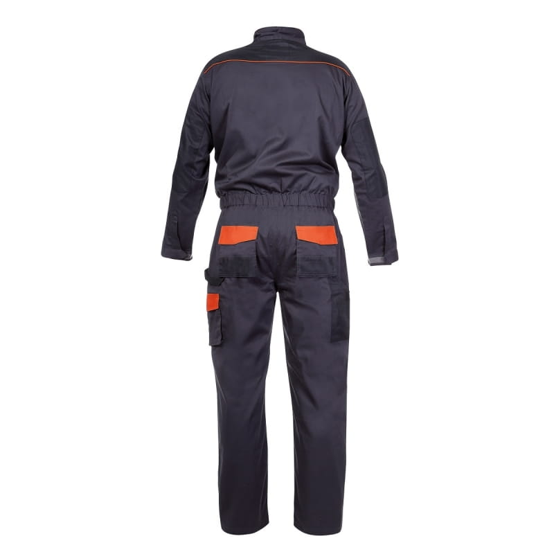 Kombinezon roboczy Lahti Pro L41501 wykonany z 35% bawełny oraz 65% poliestru. Posiada 11 kieszeni w tym siedem zapinanych na rzep. Dwustronny zamek błyskawiczny oraz otwory wentylacyjne zwiększające cyrkulację powietrza wewnątrz kombinezonu. Mocne potrójne szwy. Rękawy z regulacją na rzep i regulacja szerokości w pasie za pomocą gumki. Dodatkowe oczko na klucze oraz szlufka na młotek. Wzmocnione rękawy, karczek oraz kieszenie na ochraniacze kolan materiałem 300D (poliester) odpornym na przetarcia. Wszywka identyfikacyjna. Do kombinezonu dodatkowo można zakupić ochraniacze kolan o numerze katalogowym LPN001. Odzież robocza posiada certyfikat CE oraz normę EN ISO 13688 oraz jest w pierwszej kategorii środków ochrony indywidualnej.