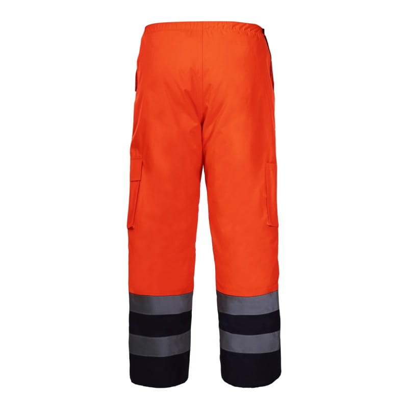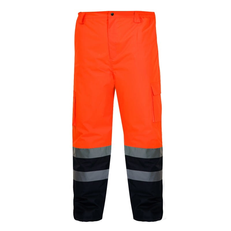 Wysoka klasa widzialności-klasa 2, pasy odblaskowe zgodne z normą EN ISO 20471. Wysokiej jakości wodoodporny (2000 mm) materiał typu Oxford 300D, pokryty poliuretanem (PU), zapewniający wysoki komfort użytkowania. Wodoszczelne szwy, regulacja w pasie za pomocą ściągacza, szlufki na pasek. Nap pokryty tworzywem chroniącym przed kontaktem z wodą. Spodnie mają 6 kieszeni.