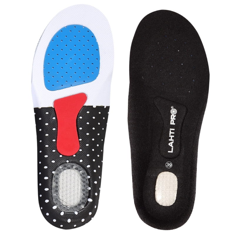Wkładki zaprojektowane specjalnie dla osób uprawiających intensywny tryb życia. Ich powierzchnia pokryta jest przewiewną tkaniną, co zapewnia stopie odpowiedni komfort i zmniejsza potliwość. Poduszka żelowa w tylnej części wkładki amortyzuje piętę przed zbyt silnymi uderzeniami. Rozwiązanie to jest pomocne również w zwalczaniu bólu spowodowanego ostrogami piętowymi, poduszka żelowa łagodzi nacisk na środkową część pięty, miejsce gdzie z reguły występują ostrogi. Wstawka z czerwonego tworzywa ma zadanie podnieść nieco środkową część stopy. Niebieska część wkładki to miękka poduszka, która ma za zadanie prawidłowo rozłożyć nacisk ciała na całą stopę. Wkładki do butów sportowe Lahti Pro L90306 wykonane są z trójwarstwowej konstrukcji tkaniny poliestrowej EVA (kopolimer etylenu i octanu winylu), wstawki TPR (Thermo Plastic Rubber, czyli gumy termoplastycznej) oraz lateksu o grubości 4 milimetrów. Zaletami wkładek Lahti Pro L90306 jest ich lekkość, perforowana powierzchnia, amortyzacja śródstopia, wyprofilowane podparcie łuku wzdłużnego, amortyzator pięty.